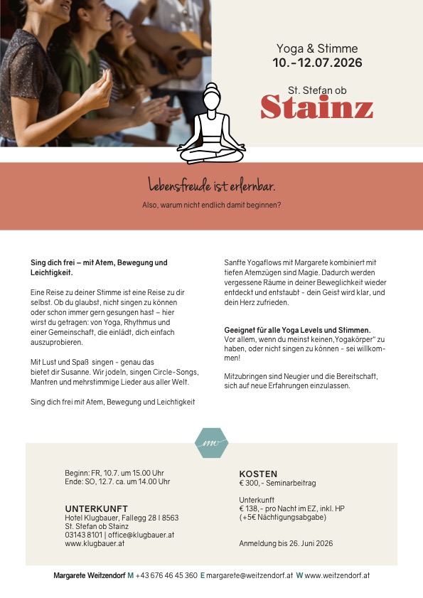 Ein vergnügliches Wochenende mit Yoga, Mantrasingen, Jodel, Rhythmus und tiefen Körpererfahrungen, gemeinsam mit Margarete Weitzendorf. Genussvolle Tage voller Rhythmus, Klang und tiefer Körpererfahrungen erwarten dich. Margarete versteht es wunderbar, Menschen für Yoga zu begeistern und jede*n genau dort abzuholen, wo er oder sie steht. Mit Spaß und Leichtigkeit geht es dann mit mir ans Singen: Mantren, Jodeln, Lieder aus aller Welt – und viel Raum für stimmliche Kreativität.